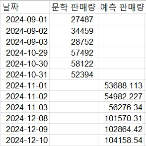 9월부터 10월까지의 판매량 데이터로 11월부터 12월 초까지의 도서 판매량을 예측한 결과입니다.