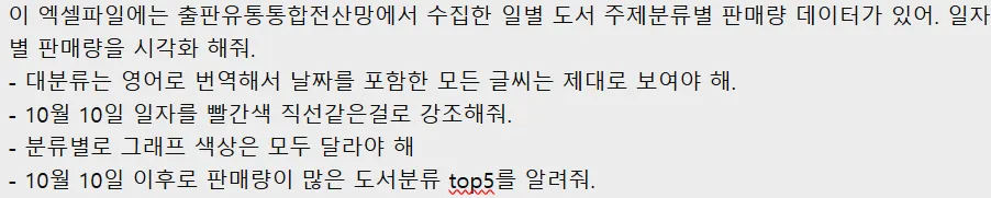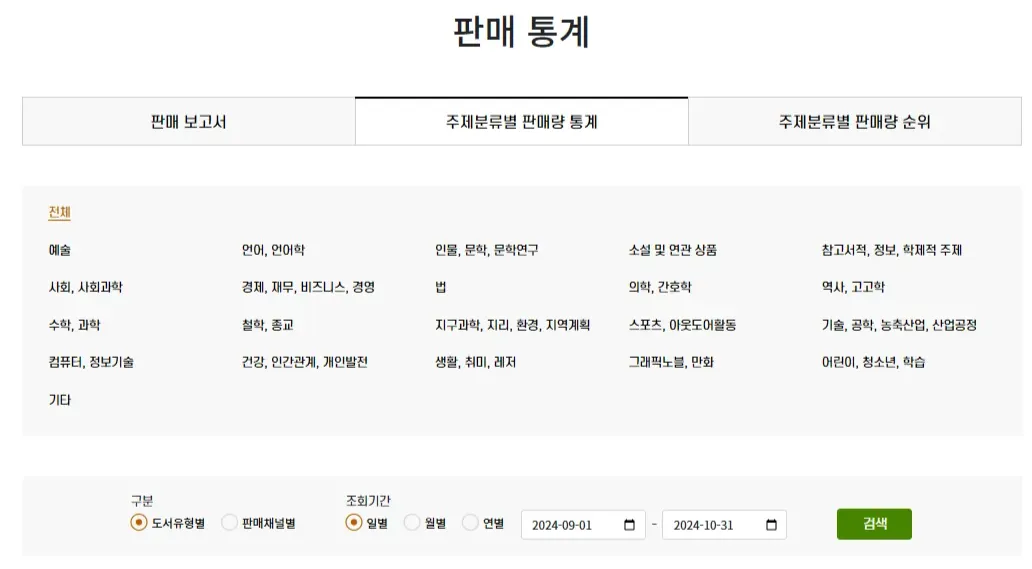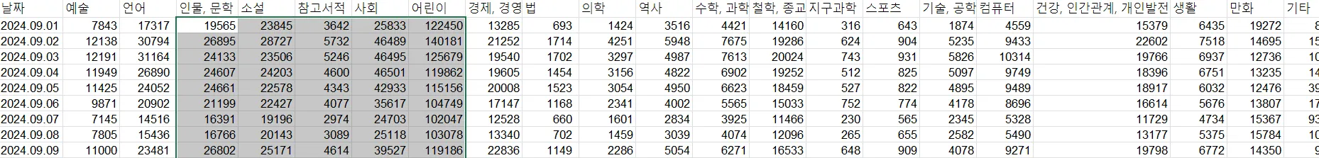 9월과 10월의 도서 판매량 데이터를 일별•주제분류별로 수집했습니다.
