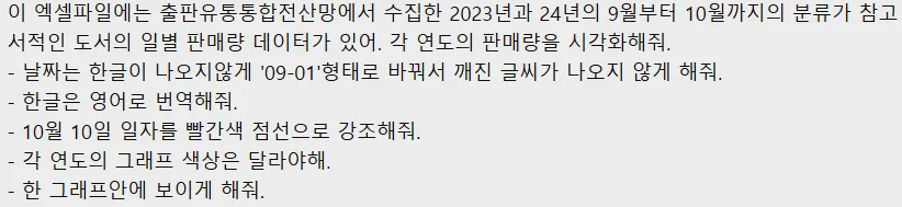 마찬가지로 Chat GPT를 활용해, 작년 참고서적 판매량 변화 추이를 시각화해보겠습니다.