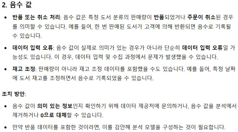 위의 답변을 통해 빈칸은 판매량이 없는 경우로 간주해 값을 0으로 대체하고, 음수는 반품이나 주문취소로 해석해 그대로 사용했습니다.
