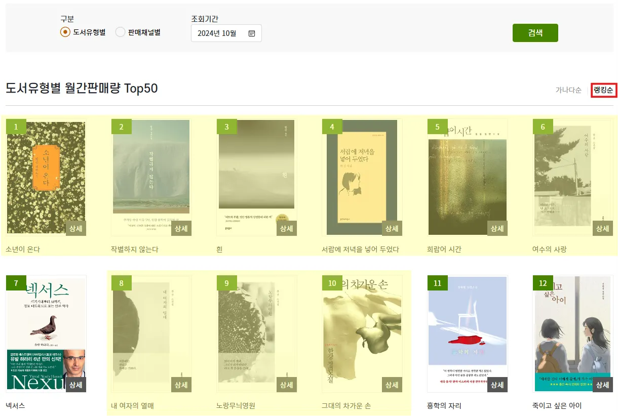 참고서적 도서들을 랭킹순으로 나열했을 때, 무려 상위 9개 도서가 모두 한강 작가의 책이었습니다.