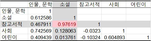 참고서적과 소설 카테고리의 상관관계가 매우 높다 (0.97619)