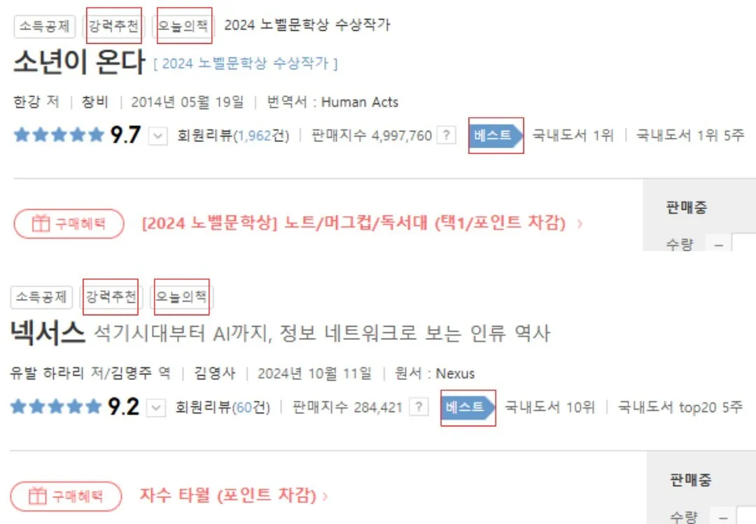2. 노벨 문학상 수상자 발표 이후 한강 작가의 소설이 베스트 셀러에 등재됨에 따라.