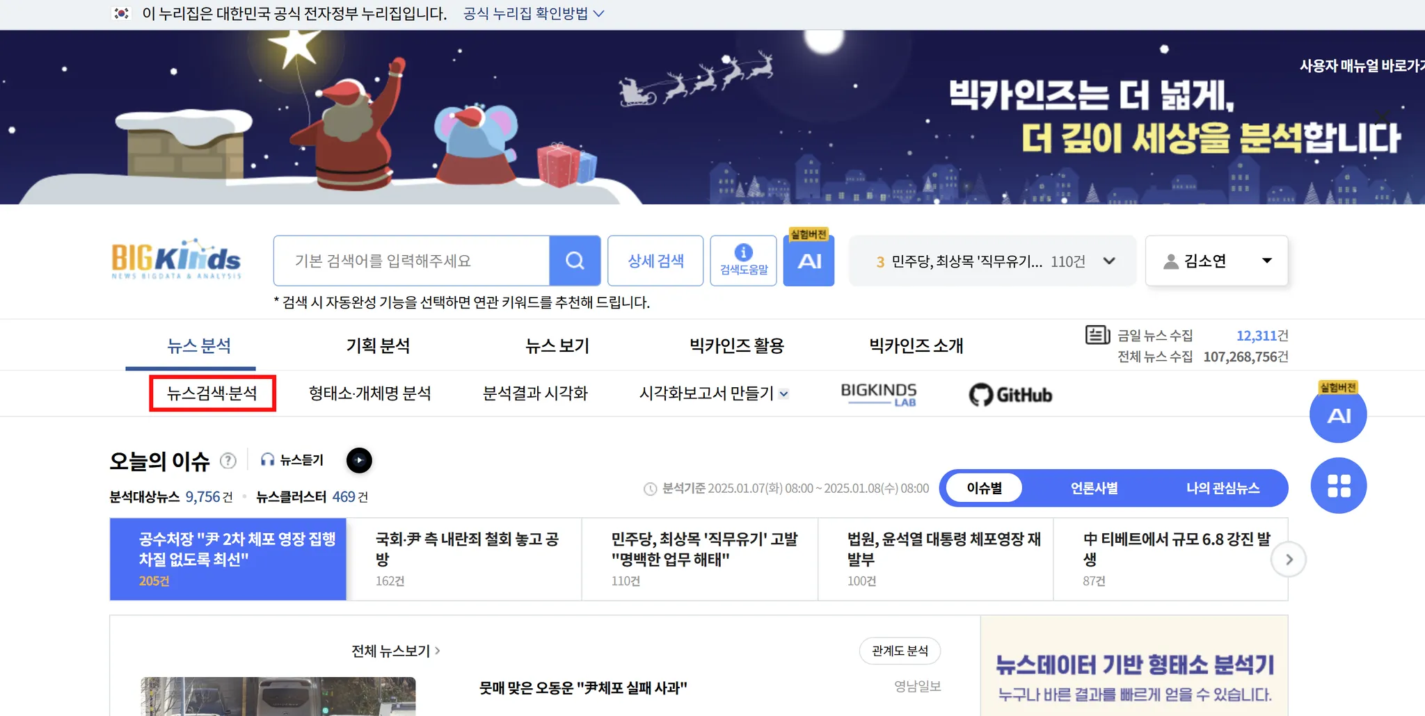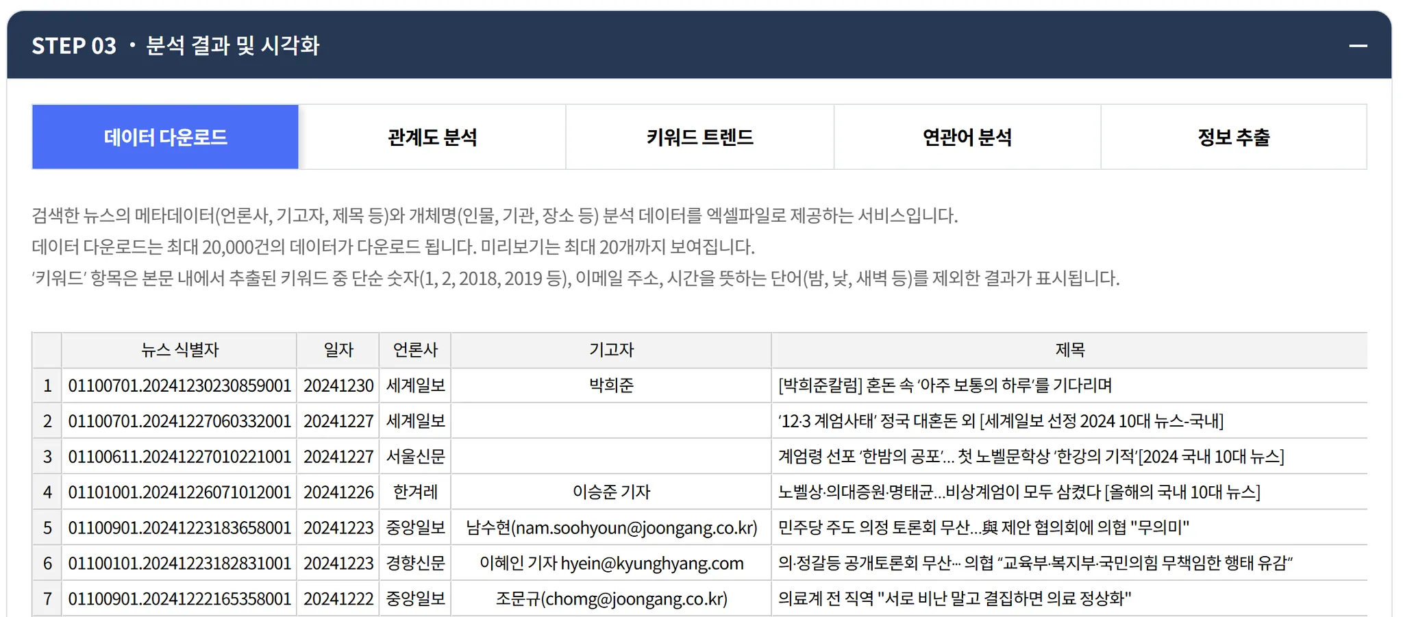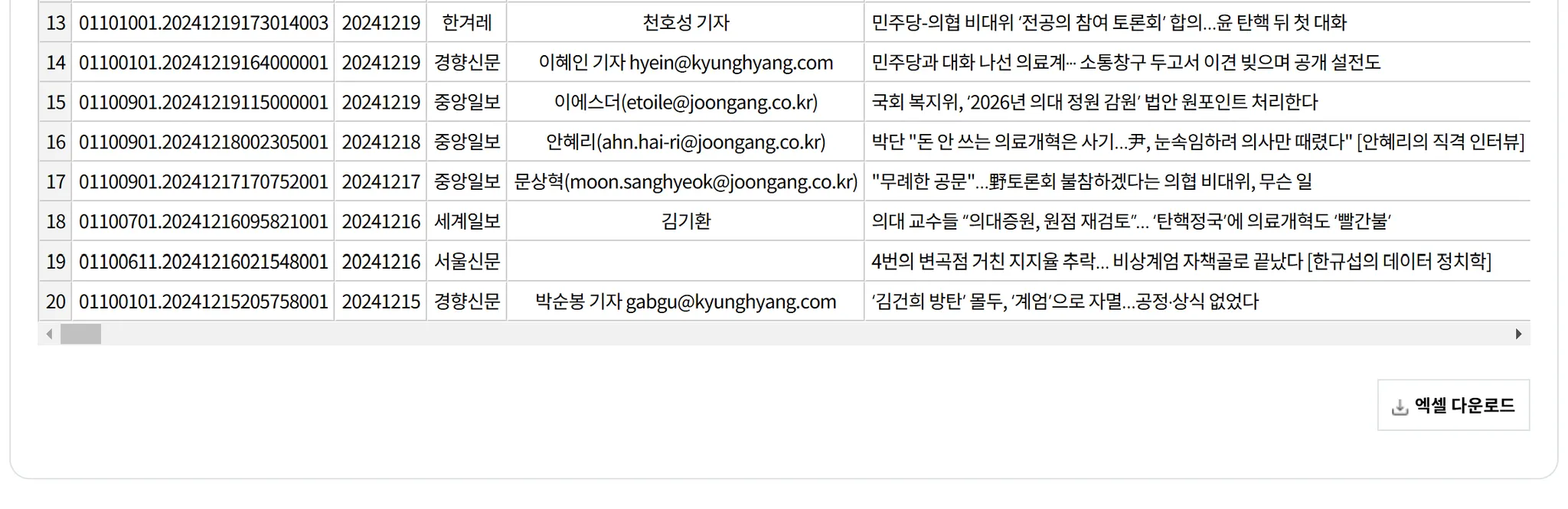 ‘분석 결과 및 시각화’를 클릭 후, 오른쪽 하단 ‘엑셀 다운로드’를 클릭합니다. 일자, 언론사, 기고자, 제목, 키워드, 특성추출(가중치 상위 50개), 본문 등 분류된 데이터를 엑셀 파일로 다운받을 수 있어요.