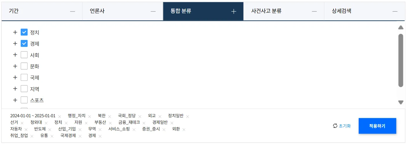 원하는 분류를 필터링 해 기사를 볼 수 있어요. 꼭 필요한 기사만 필터링하기 위해 ‘정치’, ‘경제’ 분류만 체크했어요.